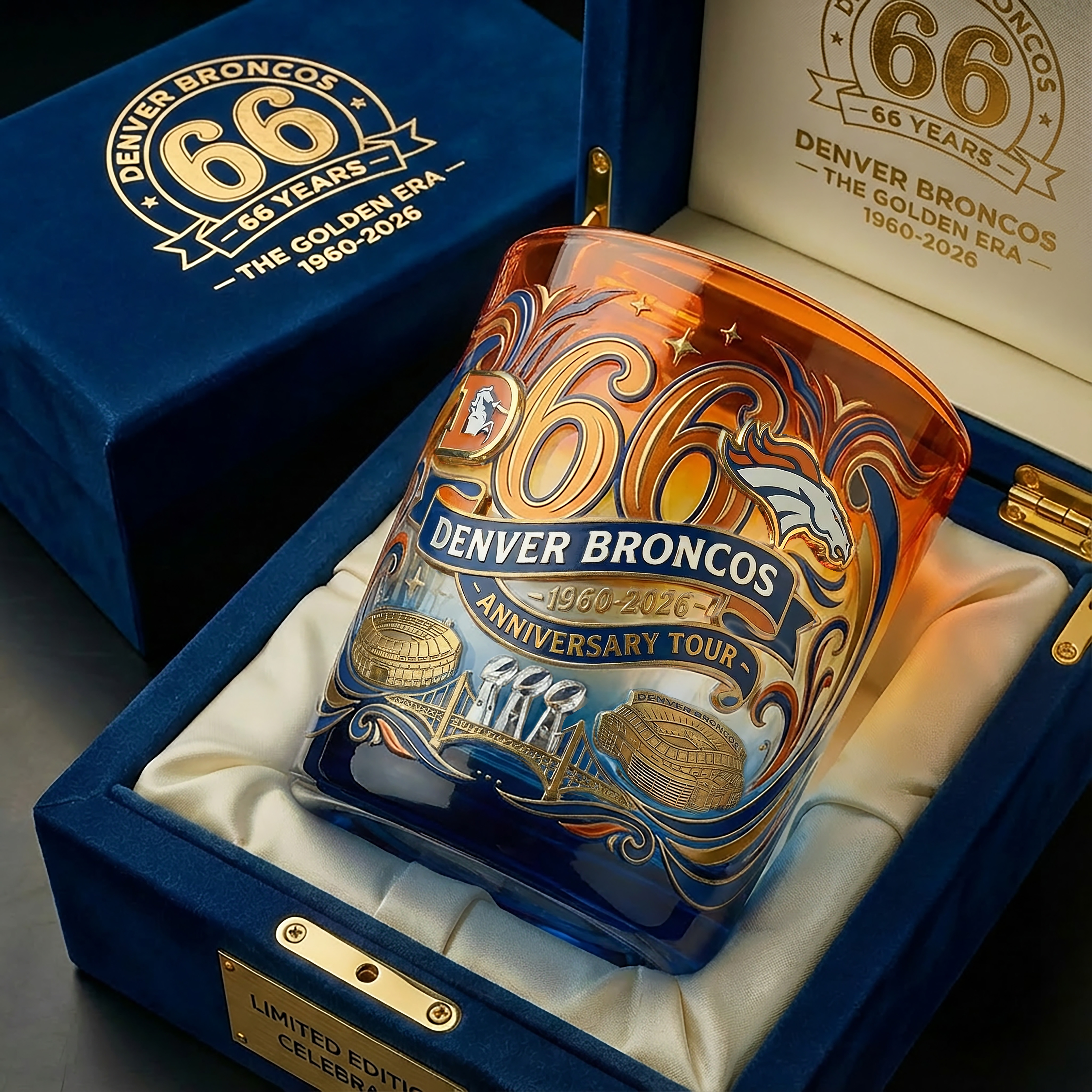 🔥 Celebrating 66 legendary years (1960–2026) of the Denver Broncos, this premium commemorative whiskey glass honors a franchise defined by grit, greatness, and unforgettable moments.