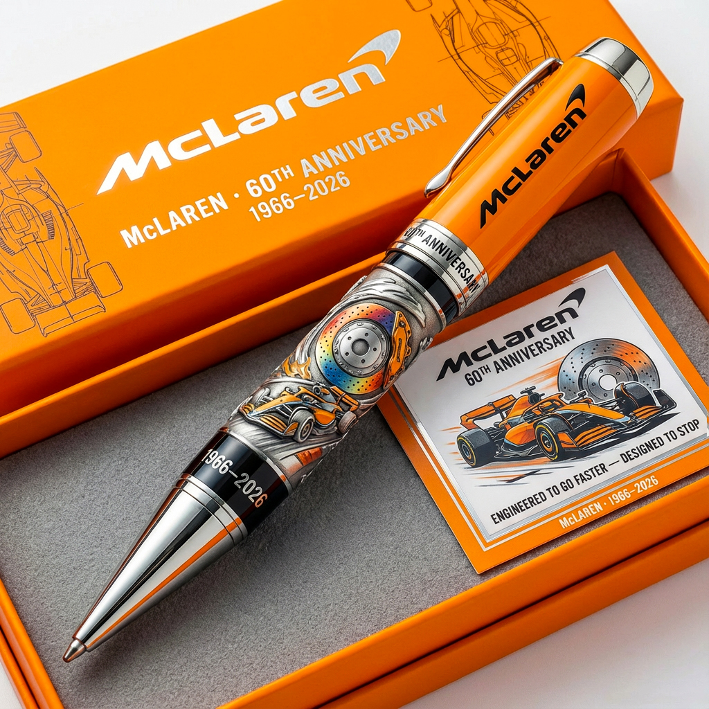 This commemorative pen celebrates McLaren’s 60-year legacy of innovation, precision, and relentless pursuit of speed. From the first race car to modern motorsport dominance, every detail reflects engineering excellence.