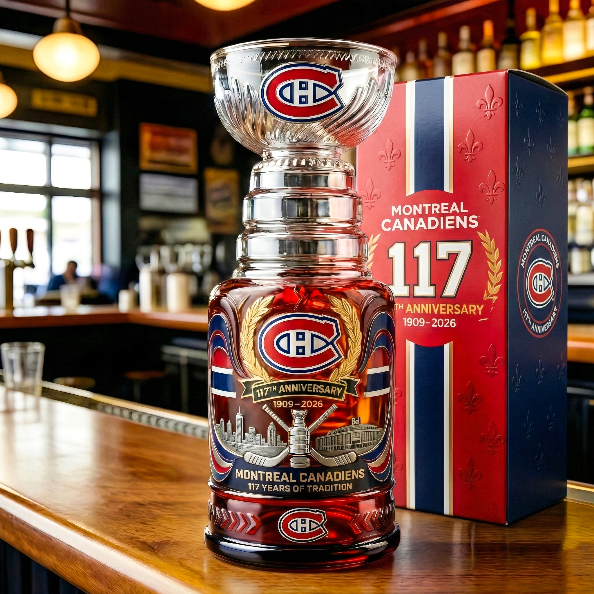 Showcasing raised, high-relief artwork, the glass features the Canadiens’ classic “CH” logo, laurel wreaths, crossed hockey sticks, city skyline elements, and bold 117th Anniversary markings — a true celebration of heritage and legacy.