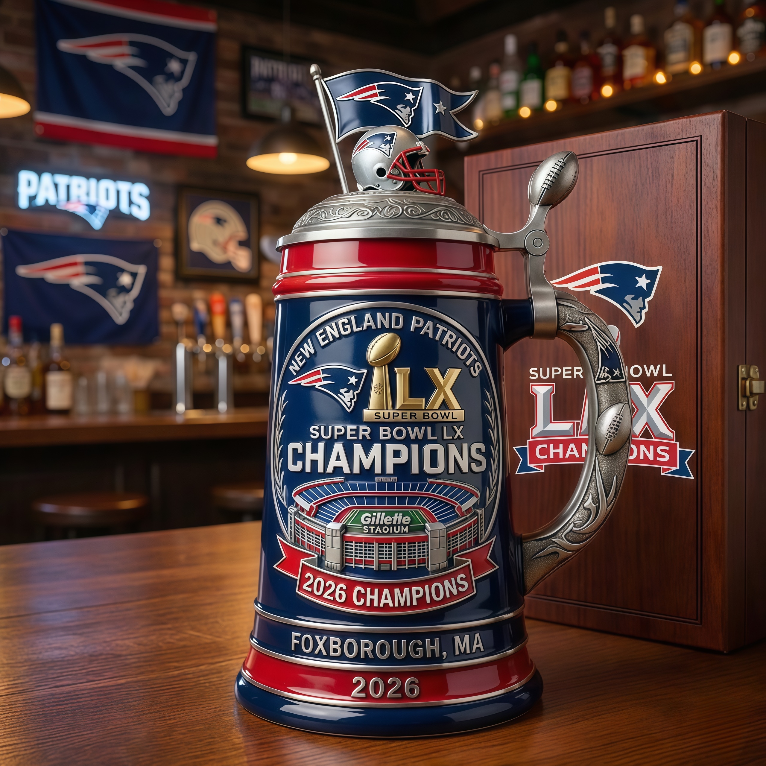 This commemorative stein captures the New England Patriots at the height of their championship legacy—Super Bowl LX, Foxborough, 2026. Every emblem, banner, and engraving freezes a moment when preparation, pressure, and performance aligned on football’s biggest stage