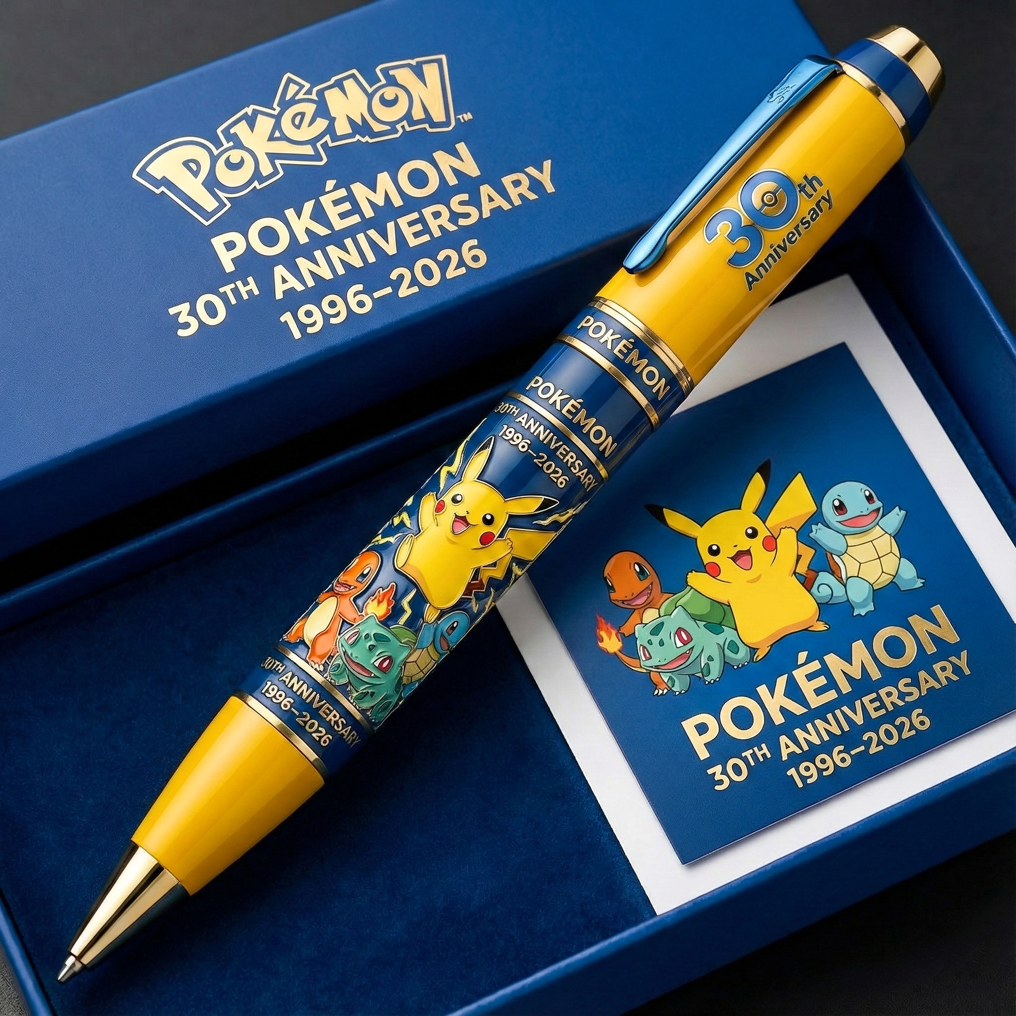 The pen barrel features a hand-painted, vibrant depiction of the original Kanto starters — Pikachu, Charmander, Bulbasaur, and Squirtle — the beloved companions that started it all. Complemented by laser-engraved “POKÉMON” branding on the clip and a bold “30th Anniversary” badge, every inch of this pen pays homage to the world of Pokémon and the adventures we’ve shared.