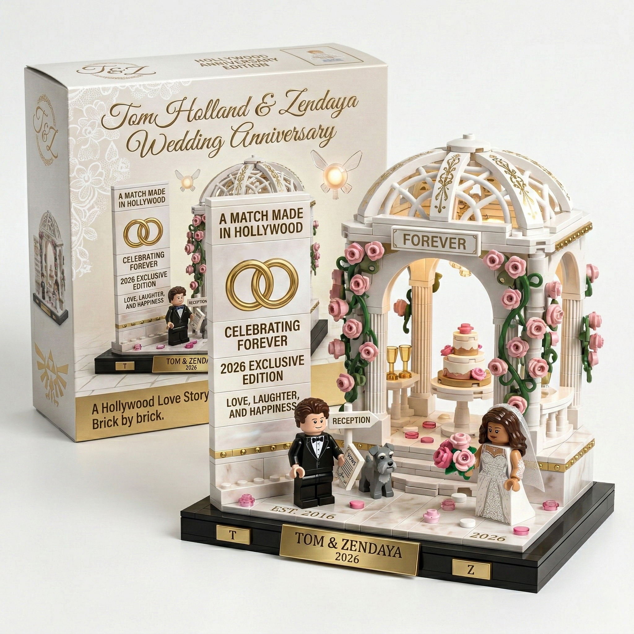 💍 Celebrate Love in Hollywood. Honor the magical union of Tom Holland and Zendaya with this exclusive building set. Featuring the iconic wedding scene complete with a romantic gazebo, wedding rings, and a cake, this set brings their love story to life. Celebrate their journey, from 2016 to forever.