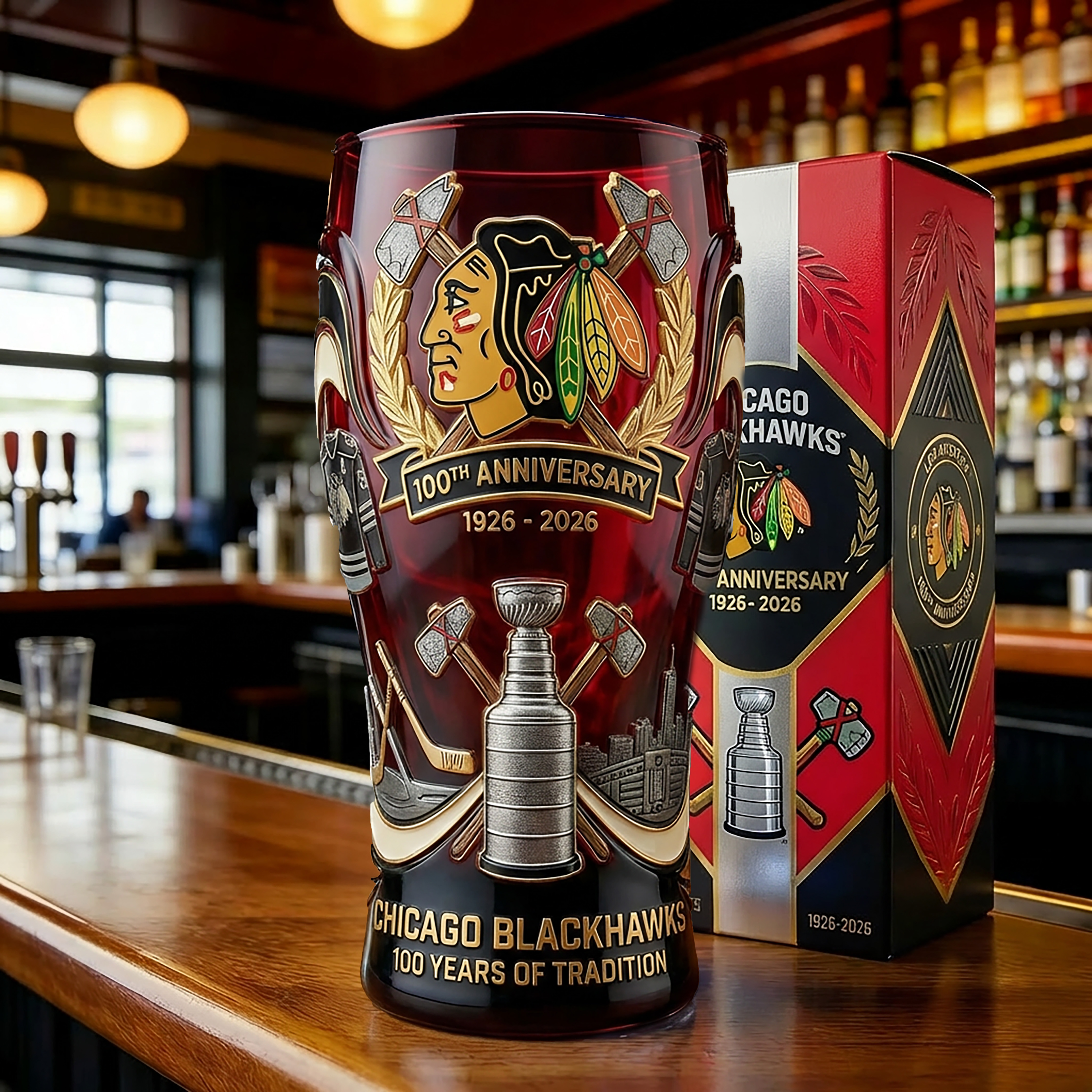 🏒 A century of champions in your hand. Celebrate 100 years of the Chicago Blackhawks with this exclusive pint glass, a true tribute to the legendary team. Featuring iconic imagery like the Stanley Cup and the Blackhawks logo, this glass captures the rich history and tradition of one of hockey's greatest franchises.