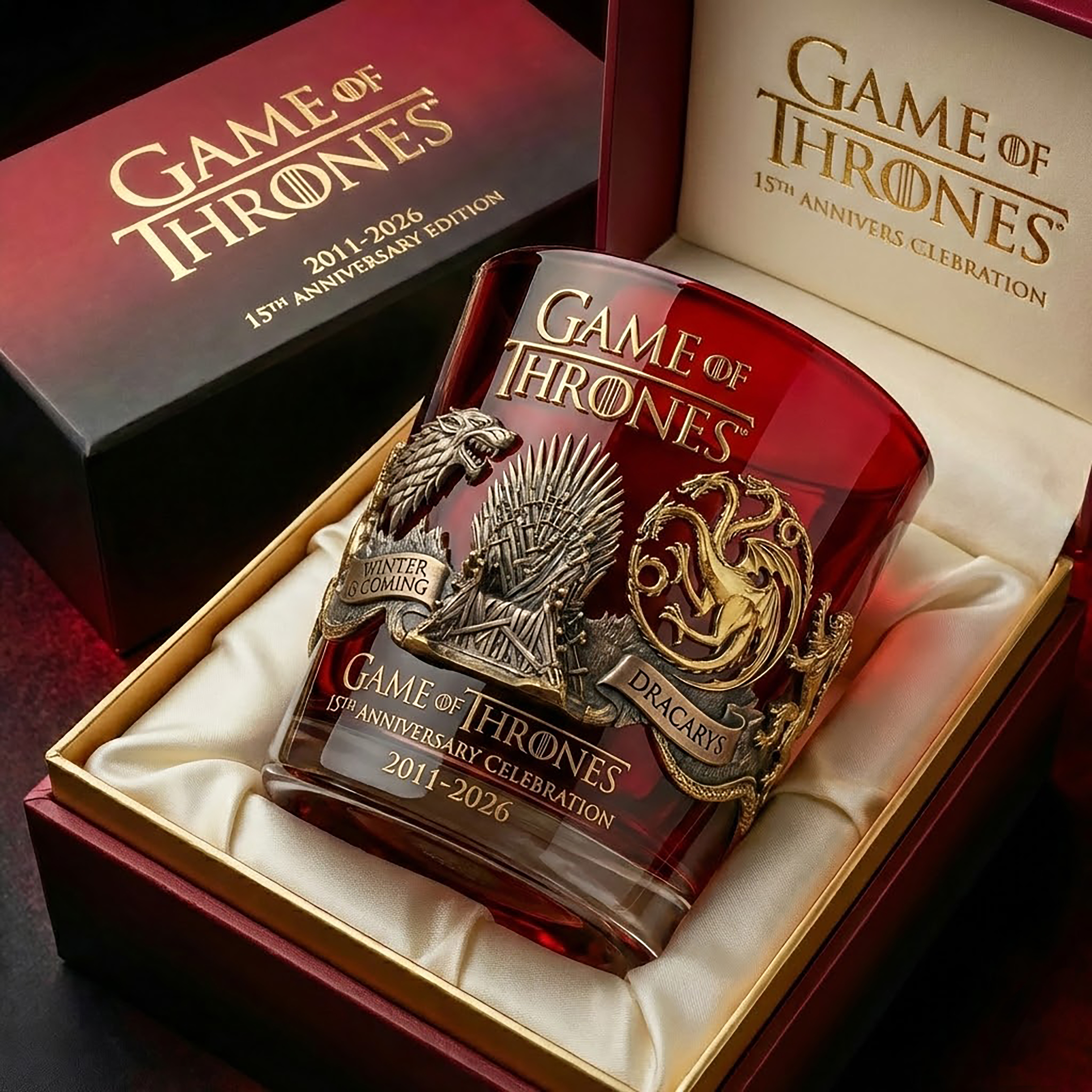 🔥 A tribute to the realm that changed television forever. This premium commemorative glass celebrates 15 legendary years of Game of Thrones, featuring the Iron Throne, iconic house sigils, and unforgettable words like 'Winter Is Coming' and 'Dracarys.' A bold piece that instantly brings Westeros to your bar.