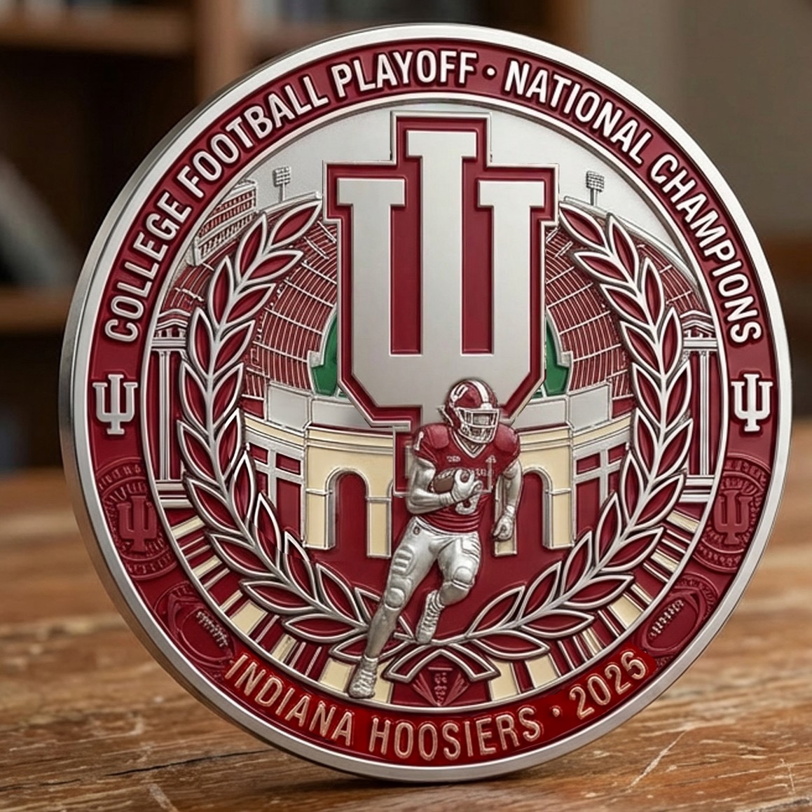🏈 Every detail honors the Hoosiers’ championship journey. The iconic IU emblem. A Hoosiers player in motion. The College Football Playoff National Championship Trophy standing at center field. Each symbol represents determination, belief, and the reward earned at the highest level of college football.