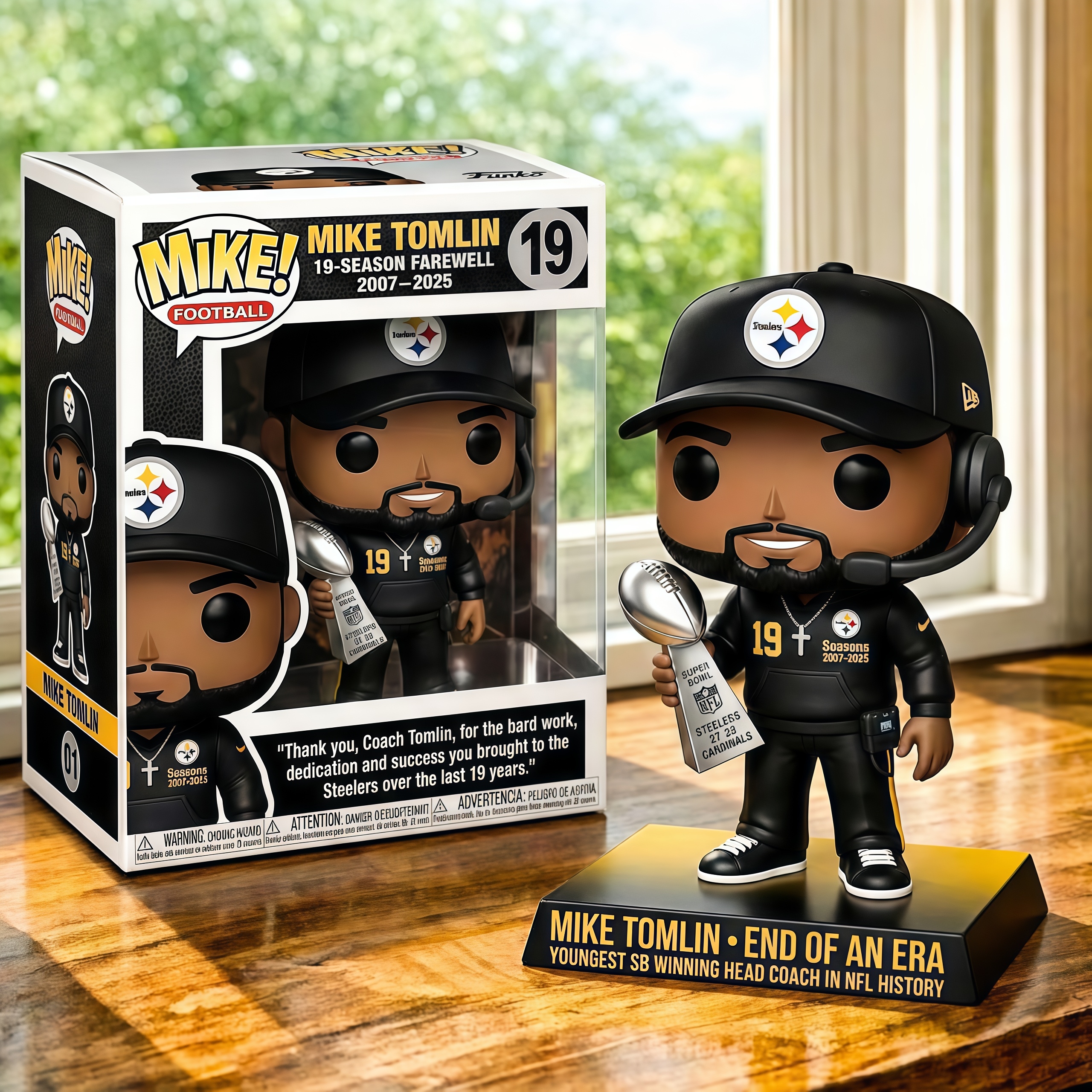 🔥Celebrating 19 seasons (2007–2025) with the Pittsburgh Steelers, this commemorative figure honors Mike Tomlin’s legendary run — zero losing seasons, unwavering standards, and a Super Bowl legacy. Released amid farewell discussions and legacy conversations, this piece captures a defining moment in modern NFL history.