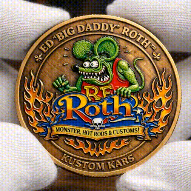 Inspired by Roth’s artistry, this coin captures the spirit of the 1960s Kustom Kulture movement. The flames, the grinning Rat Fink, and the bold "Roth" logo tell the story of a time when cars weren’t just machines, but rolling works of art.
